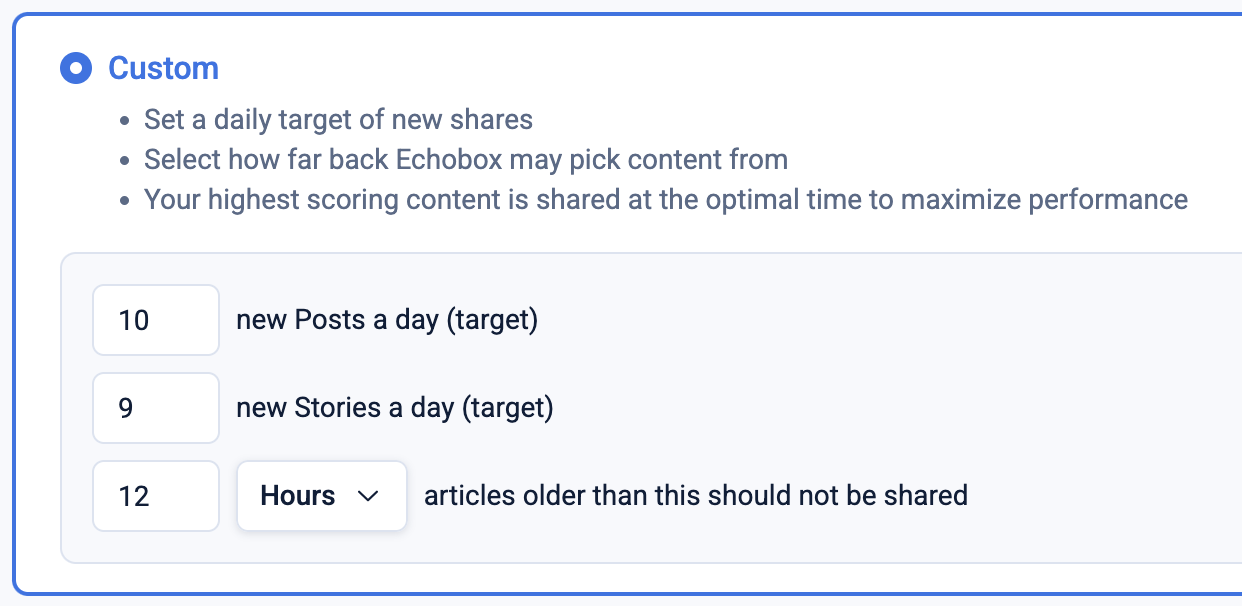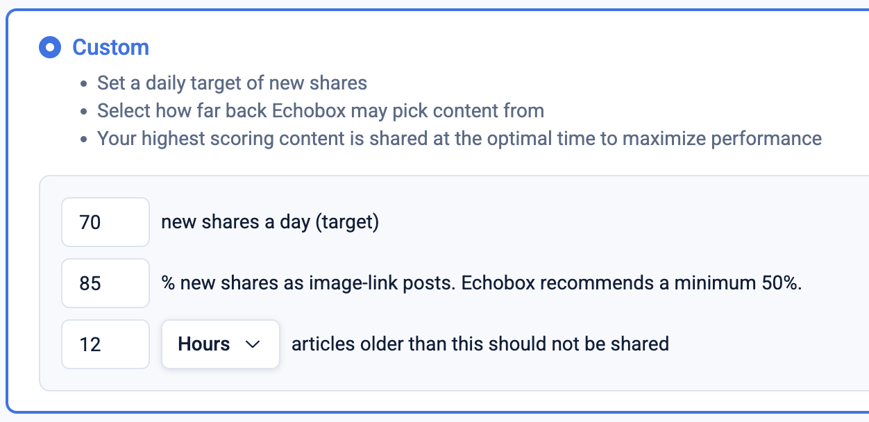 If you choose Custom automation for New Shares and/or Reshares, you can define your ideal proportion of image to link sharing.