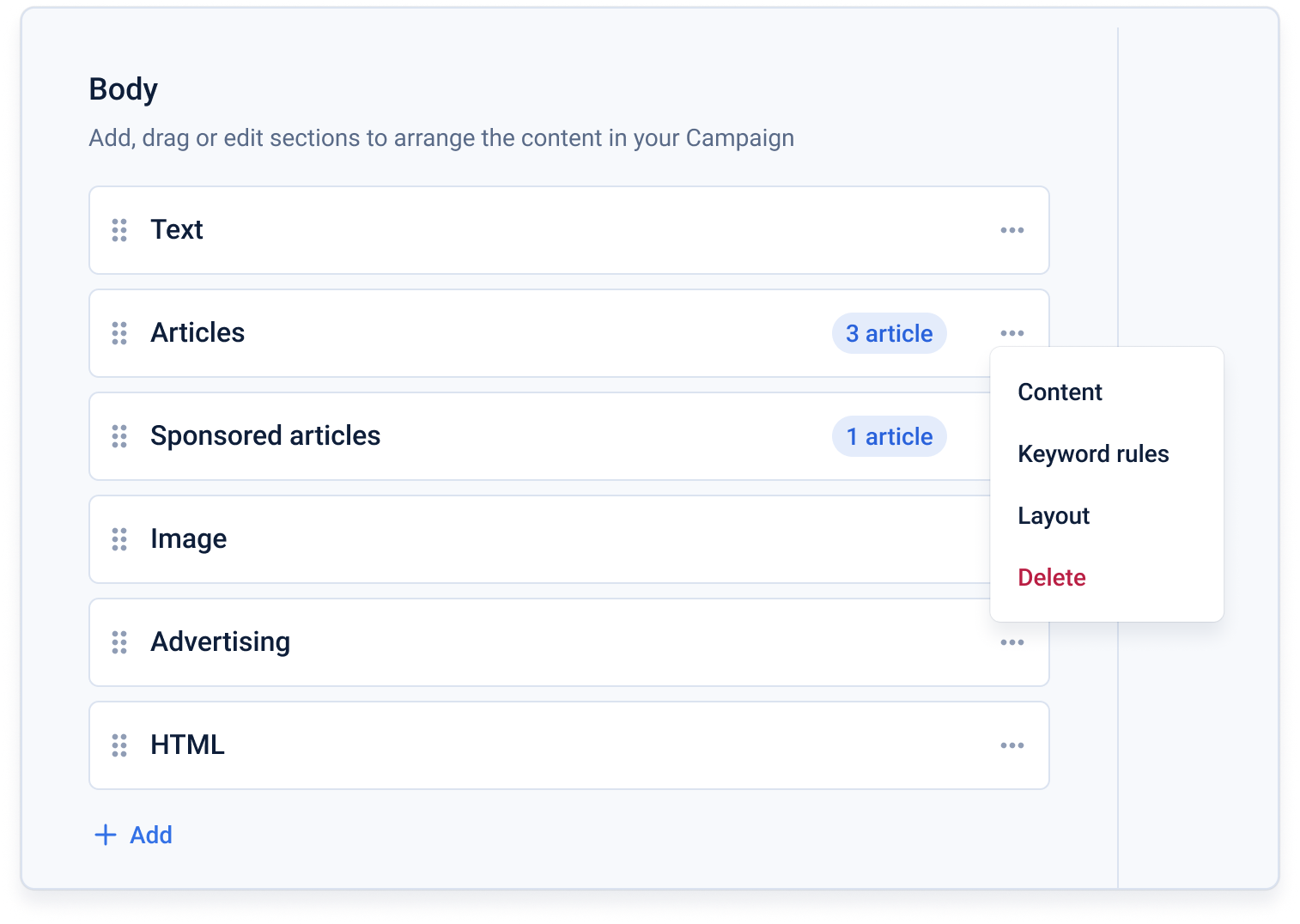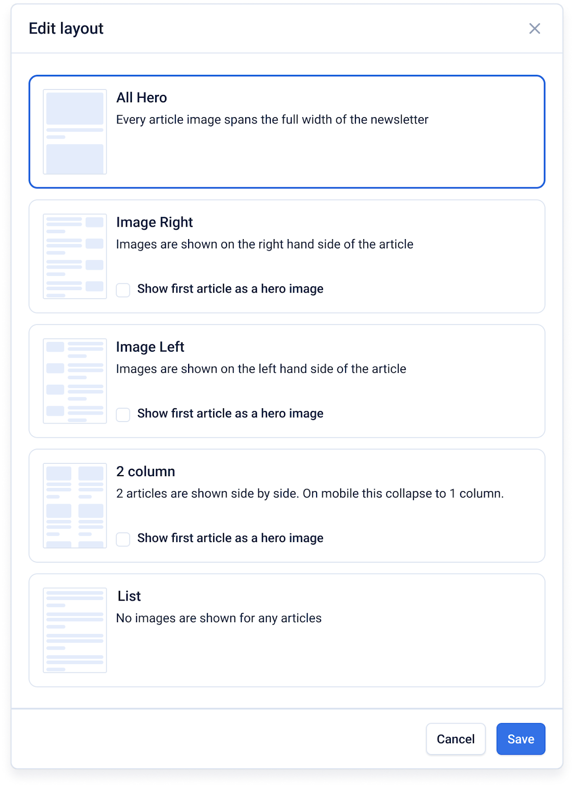 The article layout menu allows you to change the layout for each article section in your newsletter. There are 5 layouts to choose from: