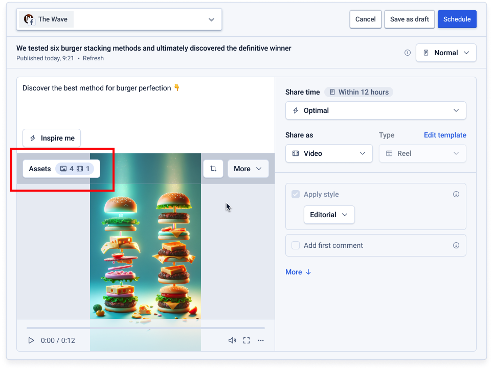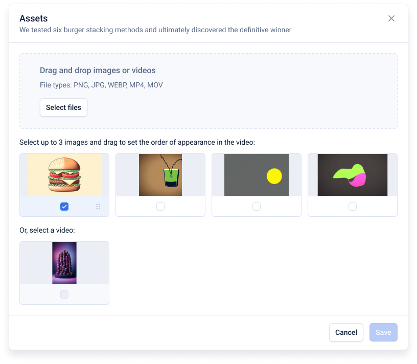 In the assets panel, you can upload additional images (up to three) or a video to form the basis of your generation.