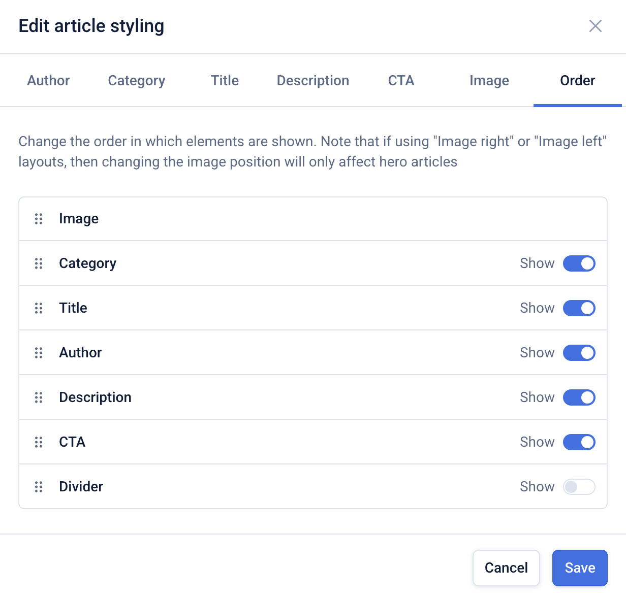 Within this menu, click on the 'Order' tab. This lists all the elements you can display and allows you to drag and drop each element to rearrange the order.