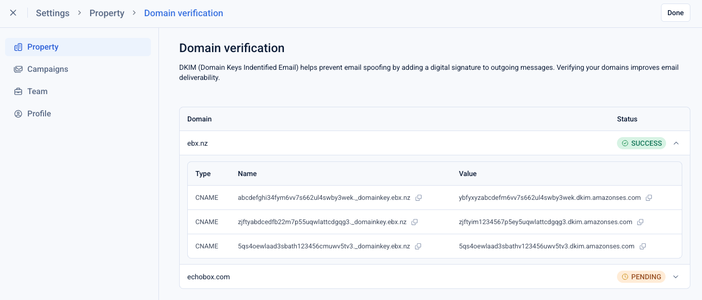 - Once your domain is verified, notify Echobox and we'll enable the property to send emails.