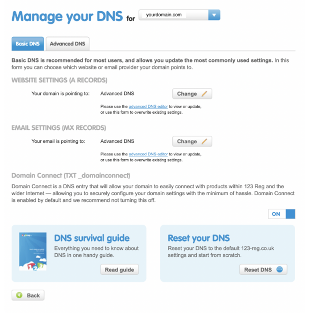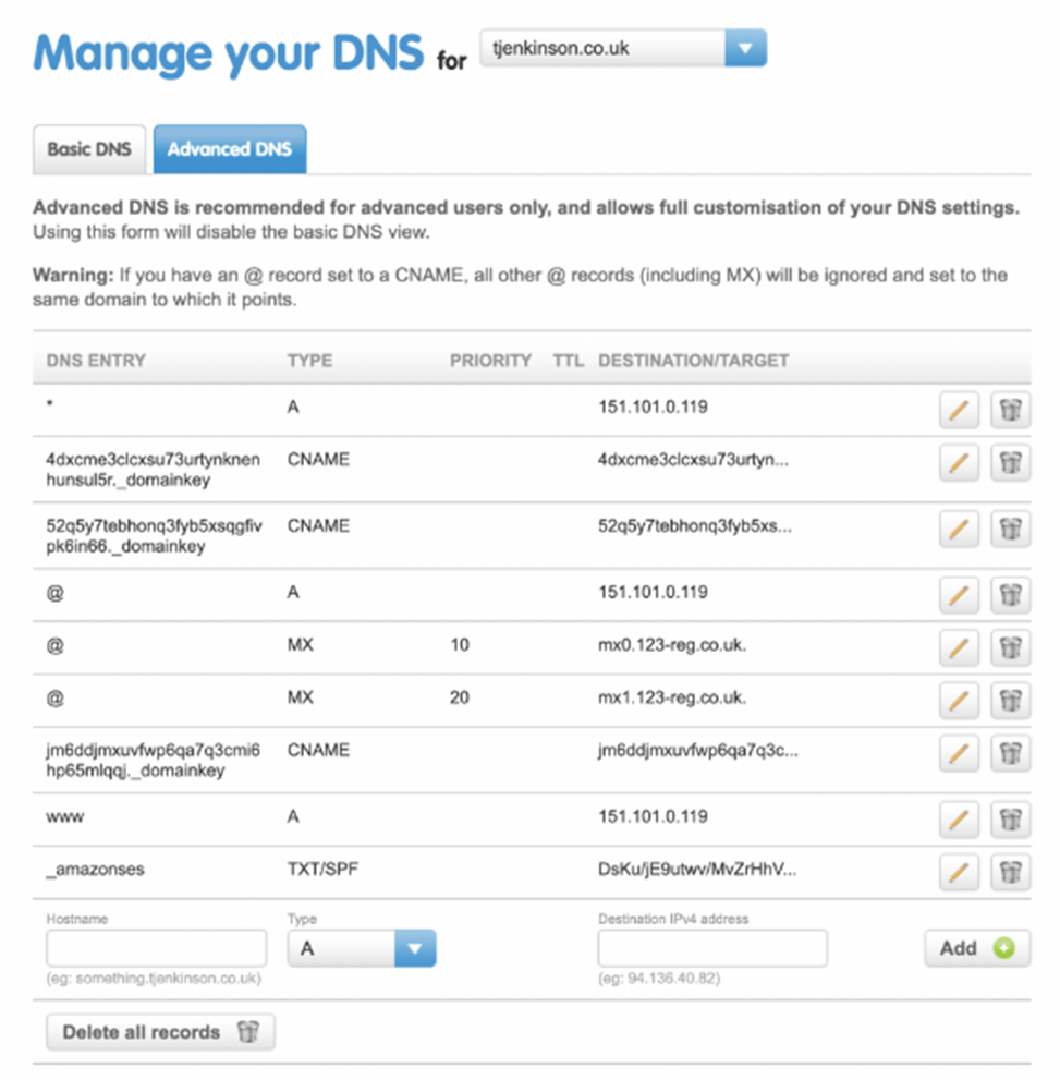 - Log into the dashboard where you can access your DNS settings. It will look something like this but will vary depending on your domain provider: