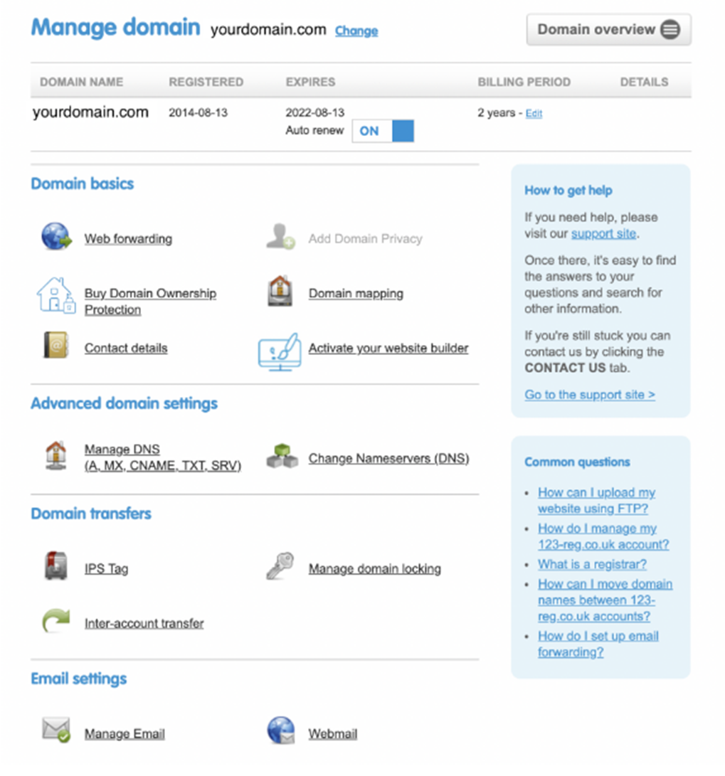 - Choose the correct domain and navigate to managing DNS settings.
