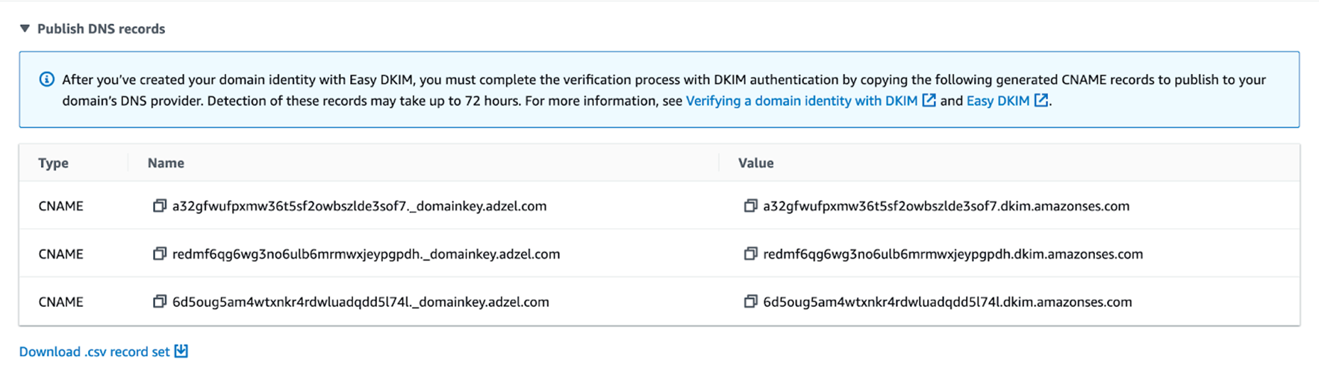 - Echobox will provide you with the CNAME records to add to your website’s Domain Name System (DNS) settings. We work closely with Amazon Web Services (AWS) to send our customers’ emails, and they require 3 records for enhanced security. They will look something like this: