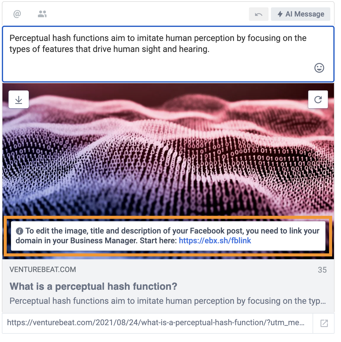 A simple way to find out is to open the compose box on the Echobox platform. If your Facebook page is not domain verified, a pop-up will appear when you hover your cursor over the image which will direct you to Facebook Business Manager.