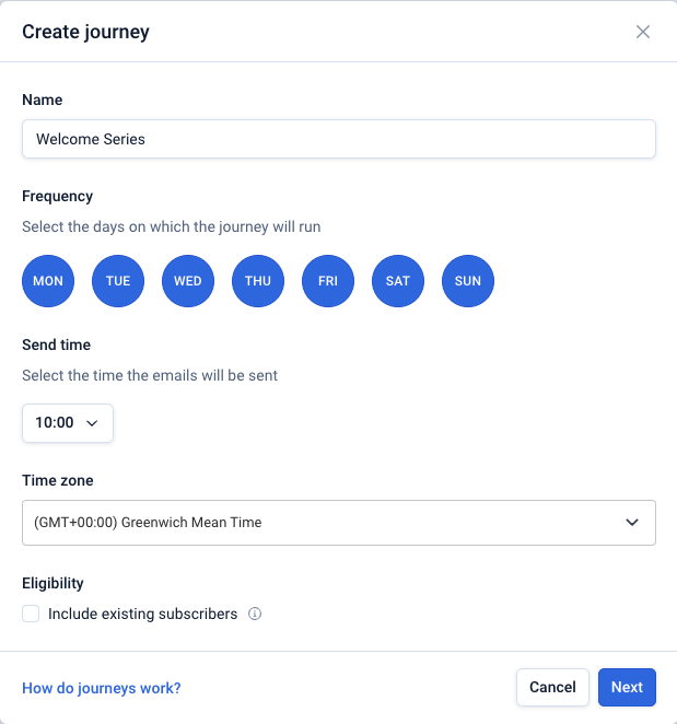 For this welcome series example, the journey will send emails every day at 10am to any new subscribers who have registered in the past 24 hours.