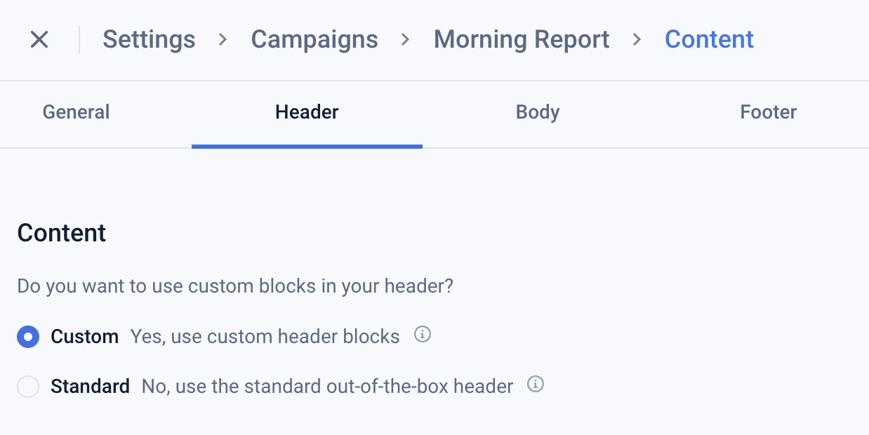 To create or edit your newsletter header navigate to Settings > Campaigns > Campaign Name > Content and click on the ‘Header’ or ‘Footer’ tab.