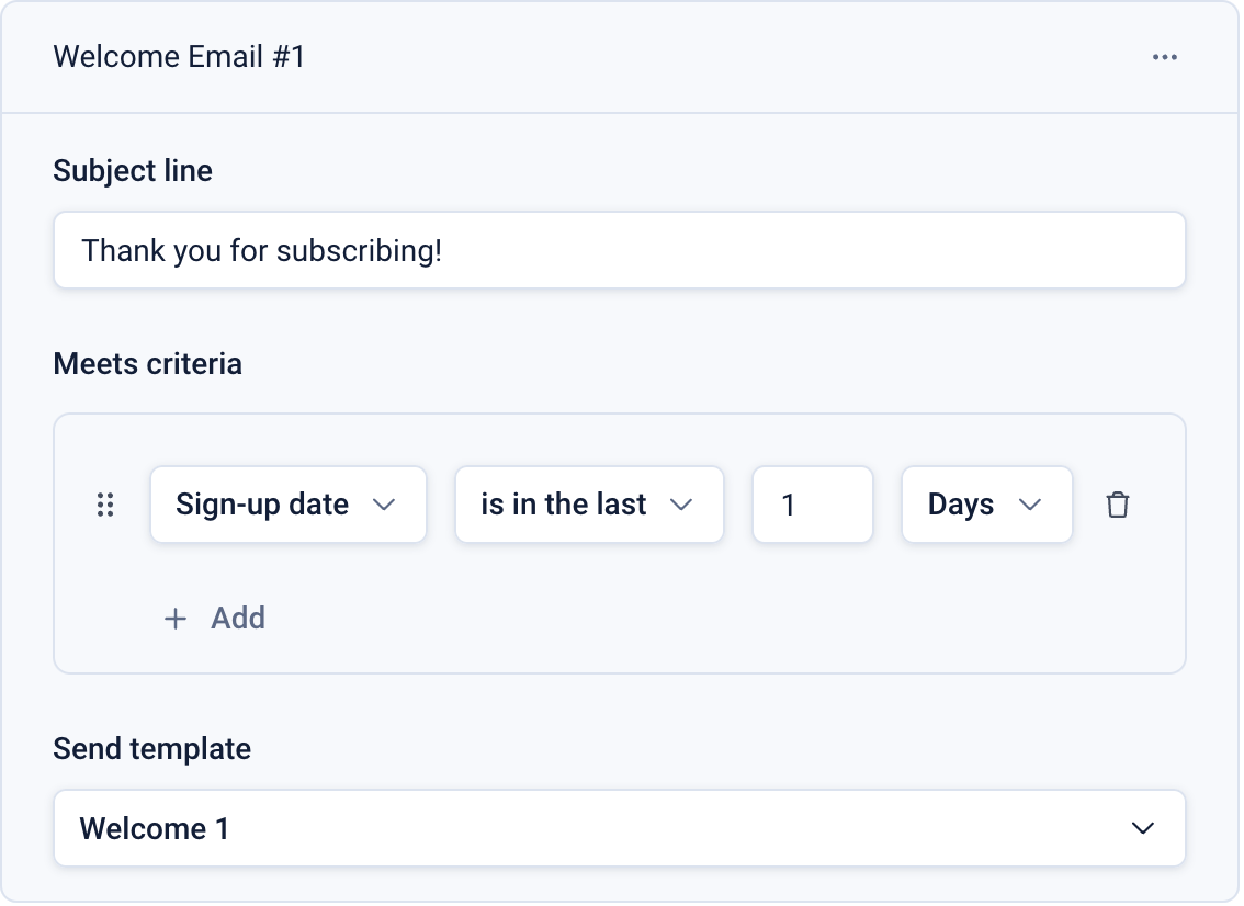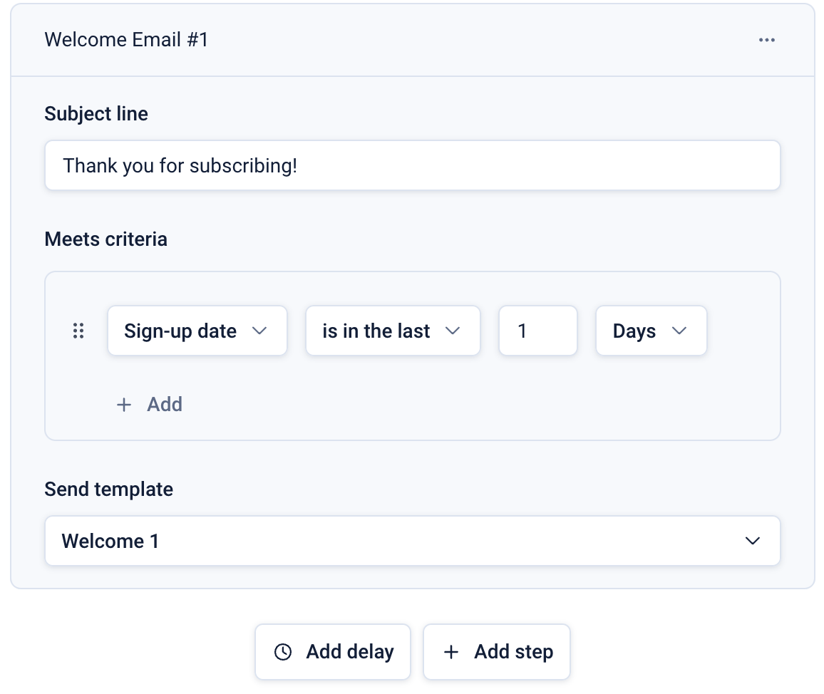 For consequent steps, the ‘Meets criteria’ is optional. Only subscribers who meet the criteria for the step will be sent the corresponding email.