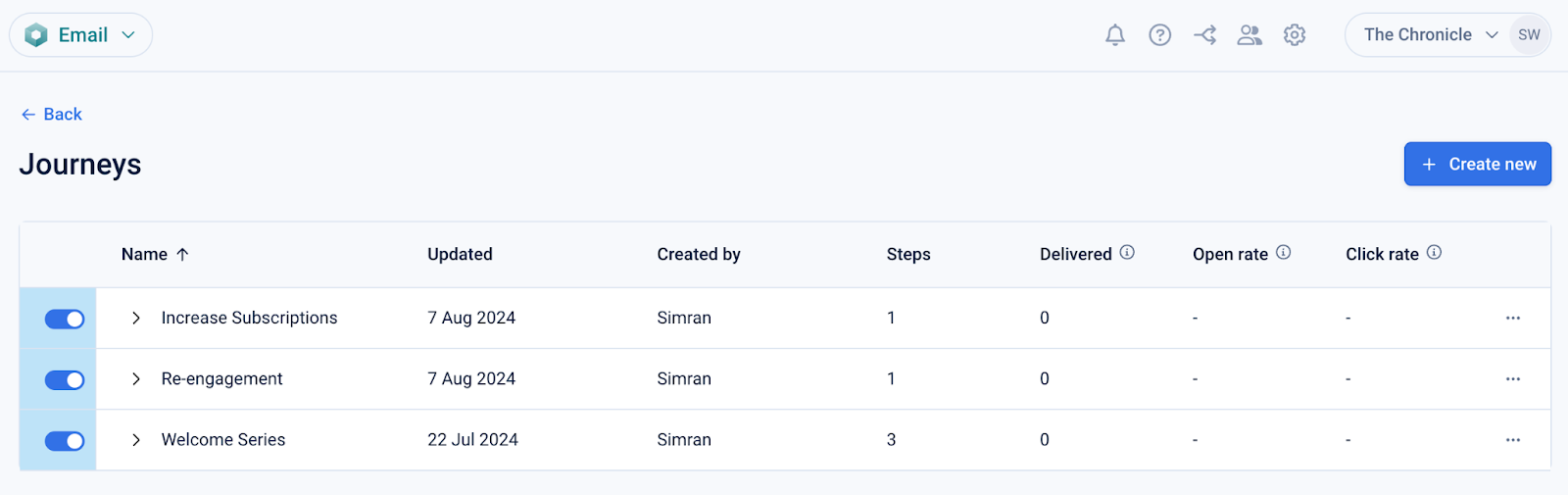 After creating the templates for the journey navigate to the journeys dashboard and click ‘Create new’. Here you can enter a unique name for your journey.