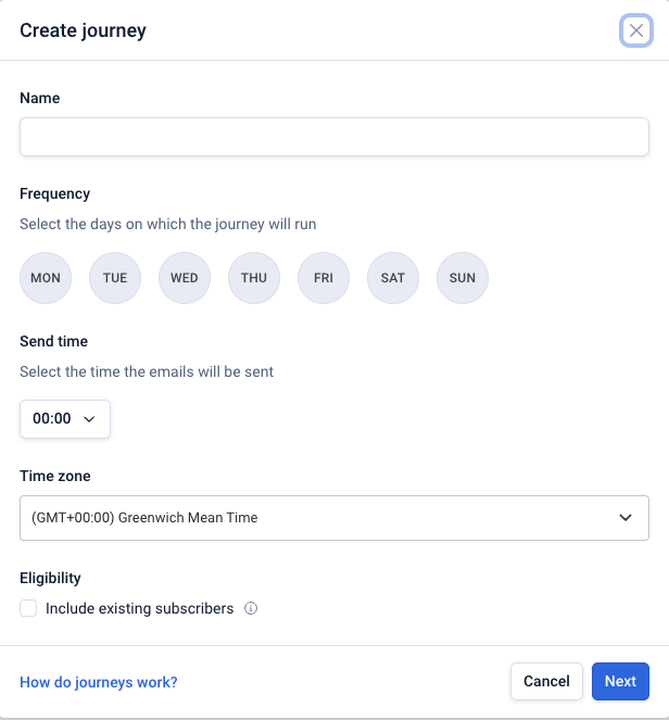 The ‘Eligibility’ section allows you to specify if existing subscribers should be included in the journey or whether they should be excluded.