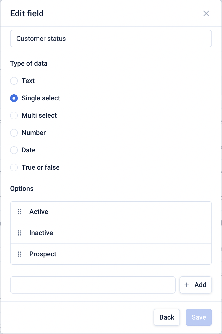 For fields of type ‘Single select’ and ‘Multi select’ you will need to add the options you wish to permit by entering each option in the input field and clicking ‘Add’.