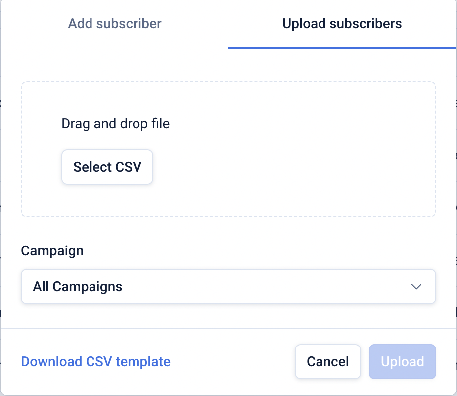 To do so click ‘Add’ and click on the ‘Upload subscribers’ tab.