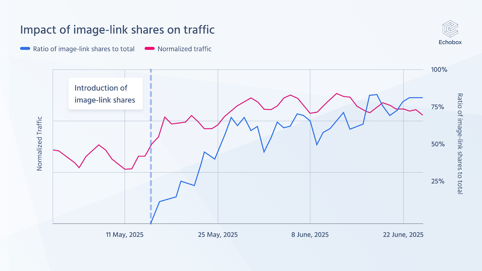 Analyzing the numbers, introducing image shares leads to an average increase in traffic of around 15%. There is significant variation, though. Some publishers achieve an uplift of 60% and above.
