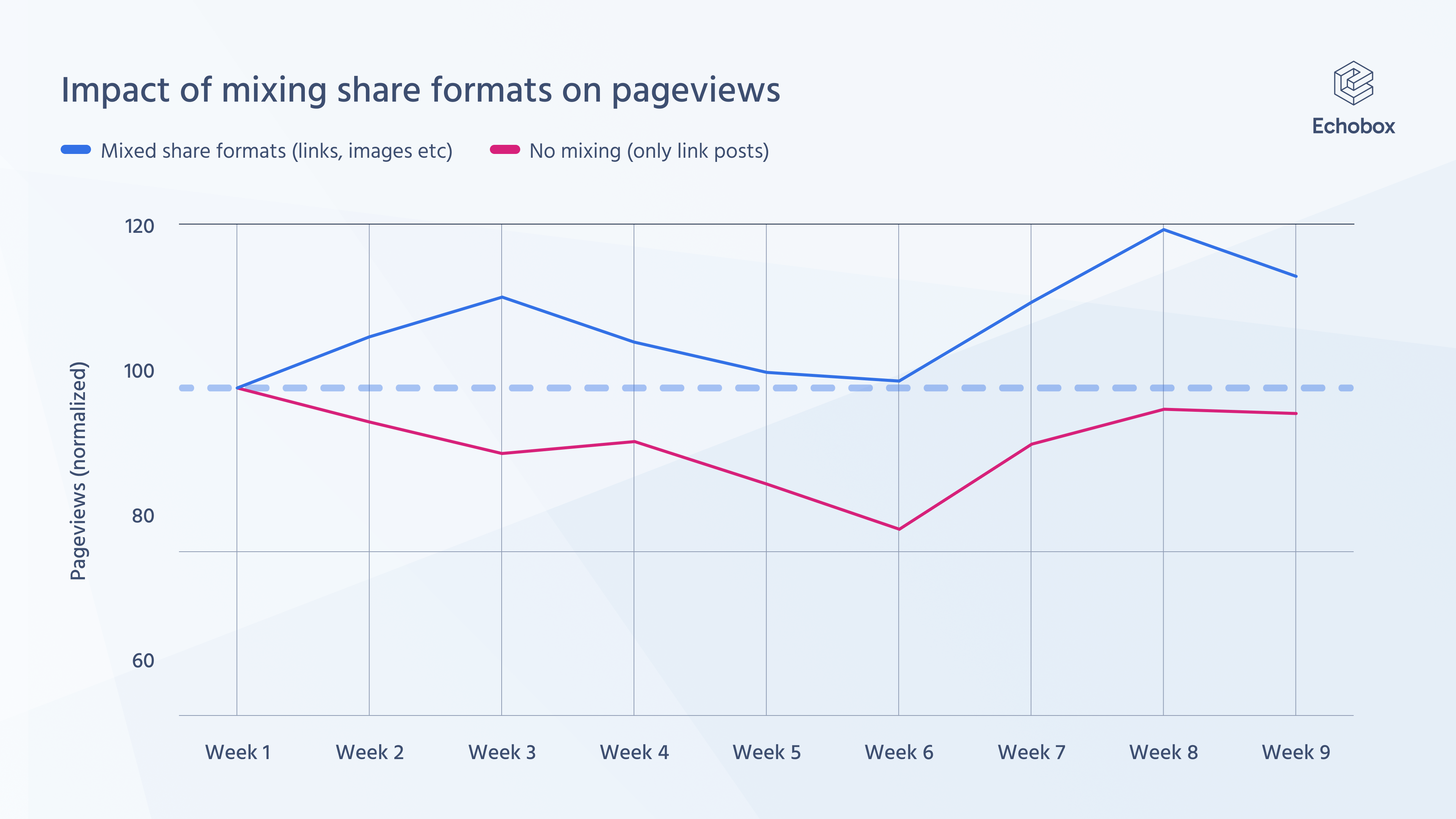 If you are already mixing share formats, then it’s crucial you find the optimal ratio between the different formats. For instance, should you be posting 20% of your shares as images, or 40%?